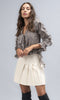 Blusa scollo a V incrociata davanti con rouches all’orlo, annodata su un fianco. Maniche dritte con rouches inserita nella cucitura e all’orlo.
