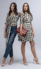 Camicia collo a uomo, senza abbottonatura, incrociata con fusciacca su un fianco tipo kimono. Maniche svasate e arricciate con polsino.