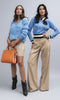 Pantalone con cinturino con passanti, zip nascosta nel centro davanti. Tagli sul davanti. Tasche a filetto.